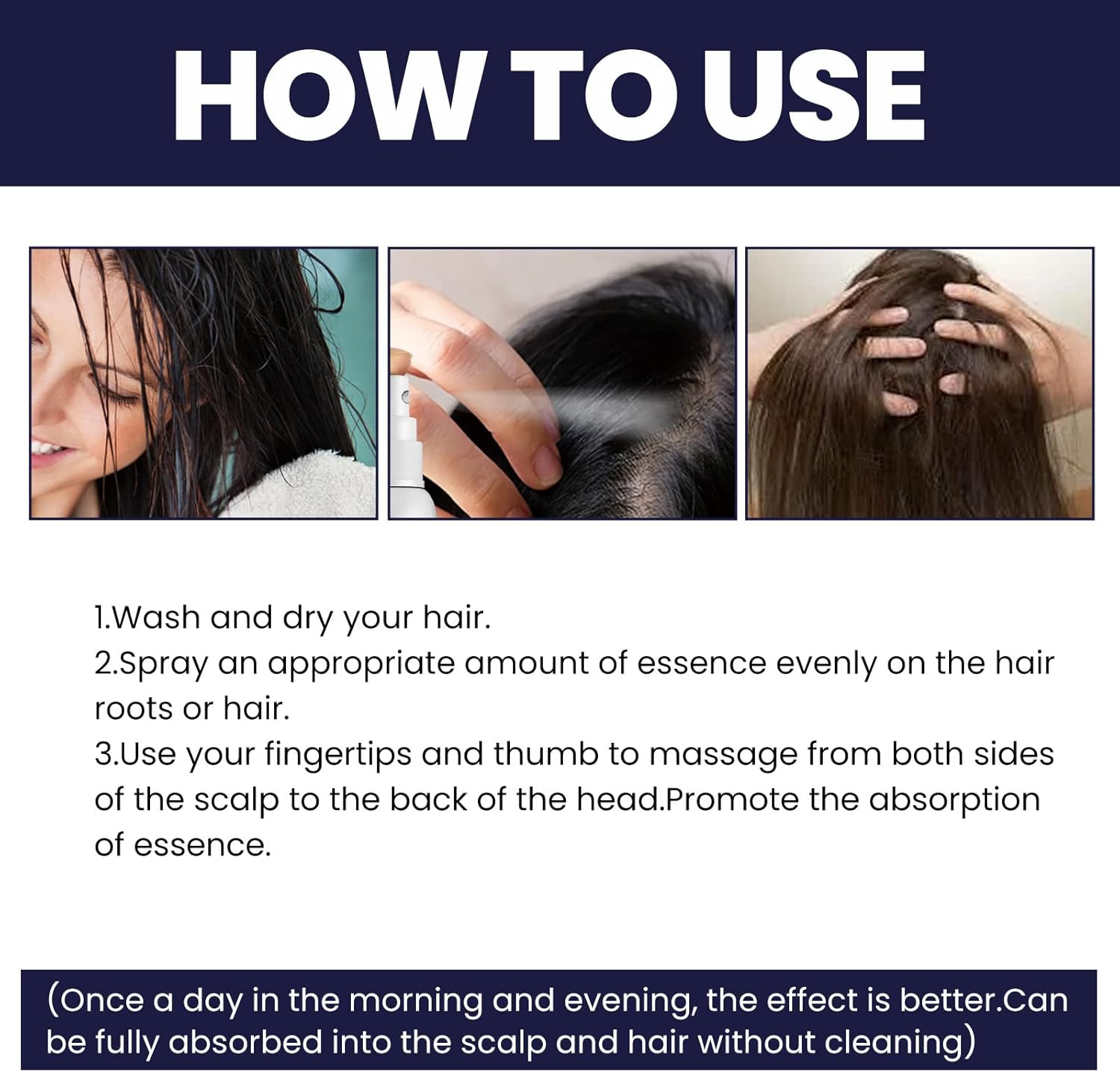 للحصول على أفضل النتائج، ضعي البخاخ مباشرةً على فروة رأس نظيفة وجافة مرة أو مرتين يوميًا. دلكي برفق لضمان الامتصاص الكامل. الاستخدام المنتظم هو مفتاح نمو أسرع للشعر ومنع تساقطه في المستقبل.
